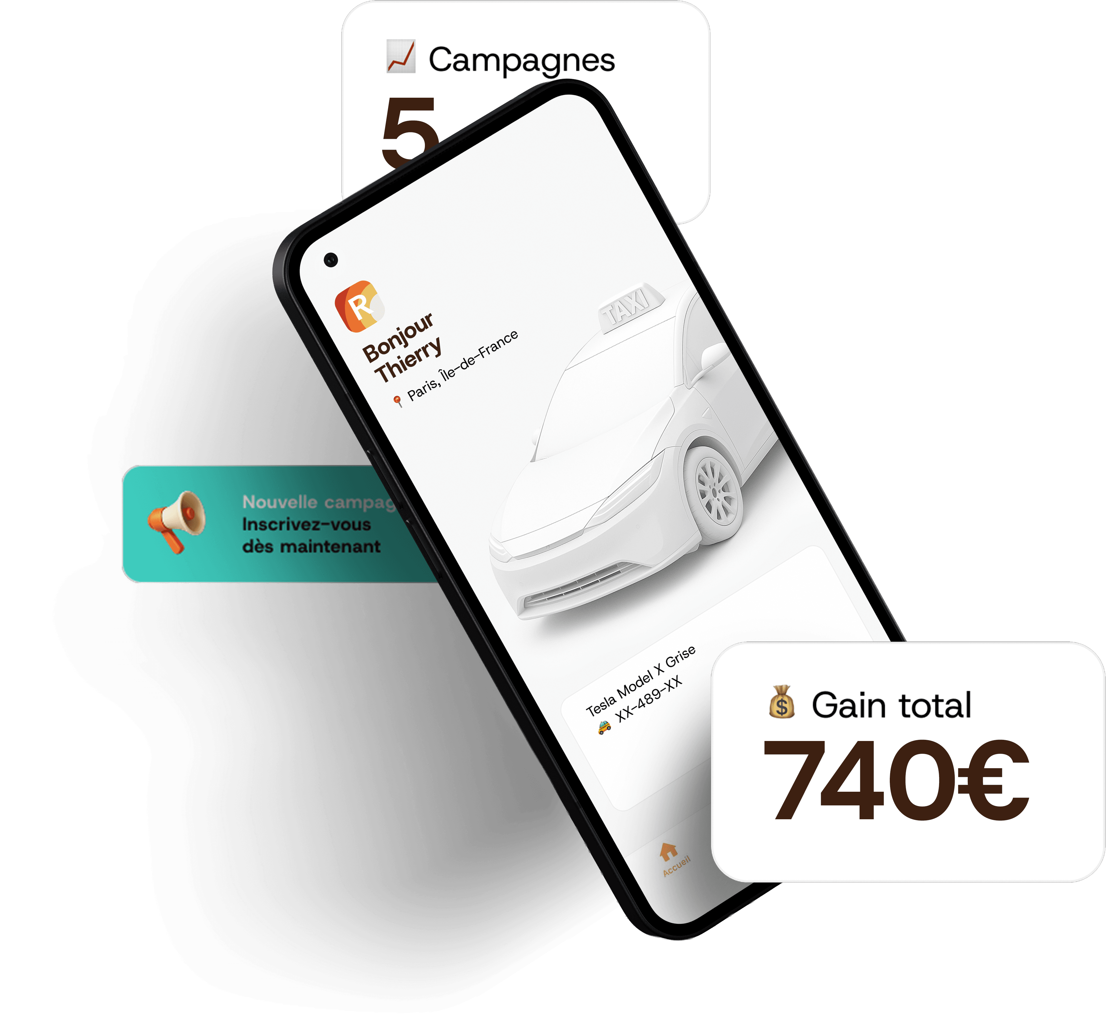 Les chauffeurs partenaires Rainbooh accèdent aux campagnes depuis l'application en toute simplicité. Grâce à cet outil, les VTC et Taxis partenaires peuvent ainsi postuler aux campagnes, prendre rendez-vous pour la pose et dépose des publicités et retrouver directement leurs informations de facturation.